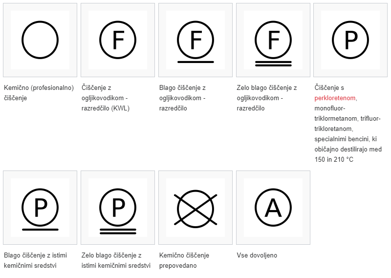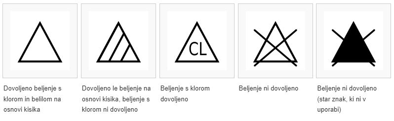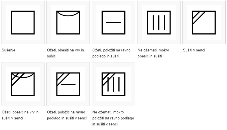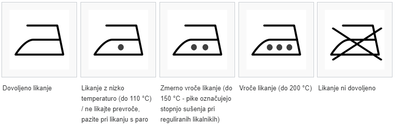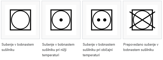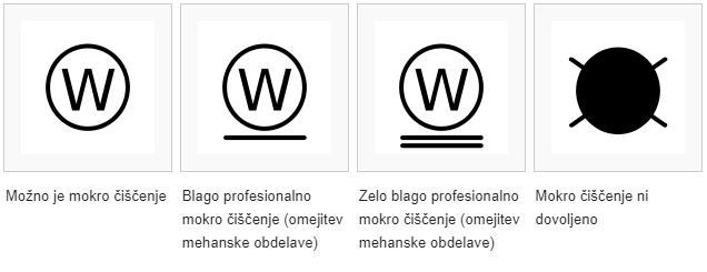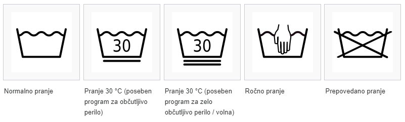 - Na simbolih za pranje je označena maksimalna dovoljena temperatura, vendar je priporočljivo prati na manjših temperaturah, če izdelek ni zelo umazan, saj s tem varčujemo na energiji in podaljšujemo življenjsko dobo izdelka.